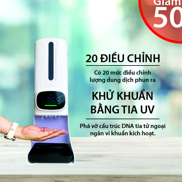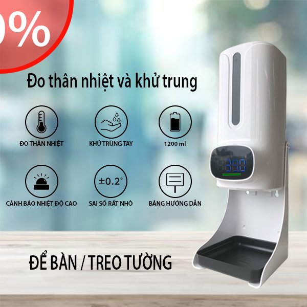 • Công suất tiêu thụ: 3W Máy xịt rửa tay tự dộng 3in1 là dòng sản phẩm nhiệt kế điện điện tử hồng ngoại vô cùng hiện đai và thông minh được sử dụng tích hợp đo thân nhiệt và xịt nước rửa tay hoàn toàn tự động rất thuận tiện và an toàn khi sử dụng. Giảm thiểu nhân lực cũng như tăng độ an toàn khi không cần người sử dụng các thiết bị đo nhiệt cầm tay (tránh tiếp xúc quá nhiều ) với thiết bị đo tự động cũng như tính năng xịt rửa tay cùng diệt khuẩn bằng UV tự động. NHIỆT KẾ HỒNG NGOẠI KHÔNG TIẾP XÚC K9 PRO PLUS kèm chức năng xịt khuẩn tự động 2 trong 1.K9 pro plus sử dụng chip cảm biến và cảm biến hồng ngoại hiện đại tiên tiến công nghệ cao nhất của nhật bản có thể đo một cách an toàn và nhanh chóng trong vòng 500 mili giây, đo thân nhiệt chính xác cực cao Độ chính xác : 1 +/- 0,2 ℃ (34 ~ 45 ℃ ) giúp đo thân nhiệt nhanh chóng , chính xác , hiệu quả , cảm biến cực nhạy sẽ xịt khuẩn ngay trong lúc đo thân nhiệt cực kì hiệu quả phòng ngừa tối đa sự lây lan dịch bệnh. NHIỆT KẾ HỒNG NGOẠI TỰ ĐỘNG K9 PRO PLUS có chức năng báo nhiệt độ cao, khi nhiệt độ bất thường, đèn cảnh báo màu đỏ sẽ nhấp nháy đồng thời còi sẽ cảnh báo giúp nhân viên giám sát y tế phát hiện nhanh và hiệu quả . Đơn vị nhiệt độ có thể cài đặt độ F hoặc độ C . Sử dụng cảm biến hồng ngoại mới cực nhạy nên K9 PRO PLUS là Nhiệt kế hồng ngoại có thể đo trán , đo tay đều cho độ chính xác cao. - Màn hình hiển thị thông tin kỹ thuật số kích thước lớn, hiển thị độ nét cao hiển thị mọi thông số nhiệt độ chi tiết .Bình đựng khử trùng dung tích lớn 1200ml cho thời gian sử dụng lâu hơn . Đây là 1 sản phẩm cực kỳ hiện đại và hữu ích rất hiệu quả trông phòng chống dịch .Sử dụng cho sân bay , nhà ga, , trường học , bệnh viện , siêu thị , bến xe , nhà máy , xí nghiệp , cơ quan công sở , hộ gia đình,... Lưu ý: Độ chênh lệch của máy K9PRO PLUS khi đo thân nhiệt -+ 0.5 đến 1 độ